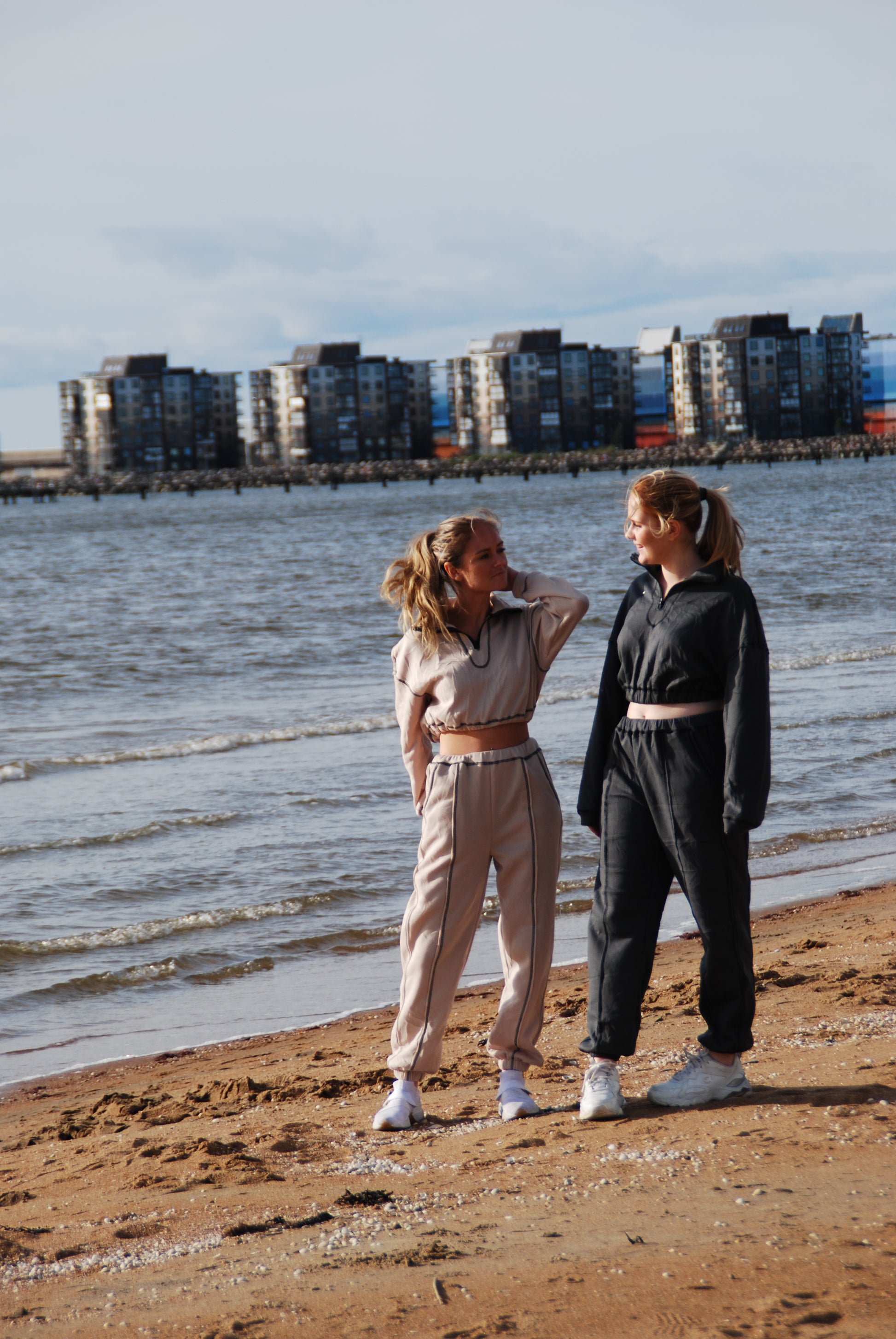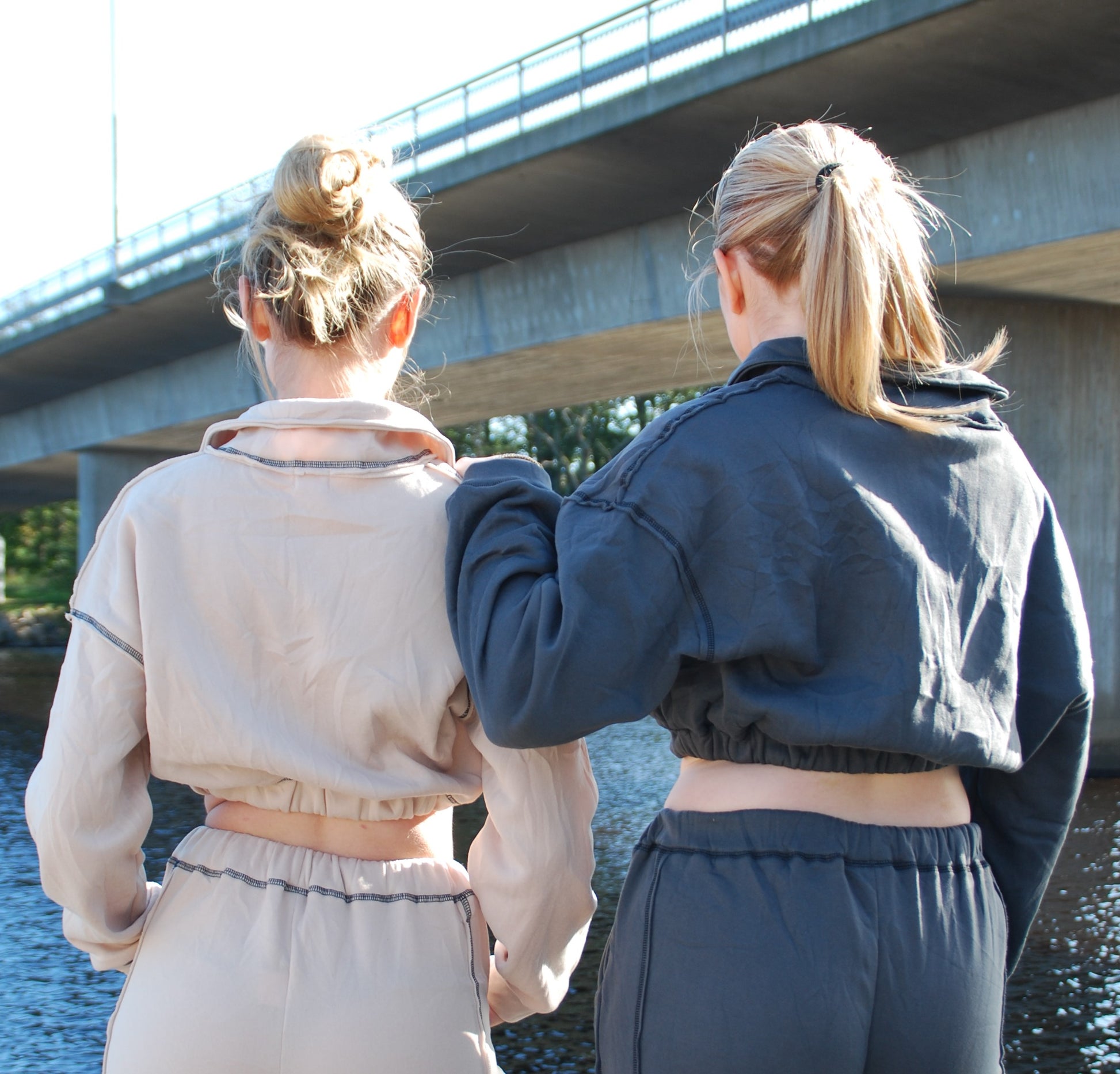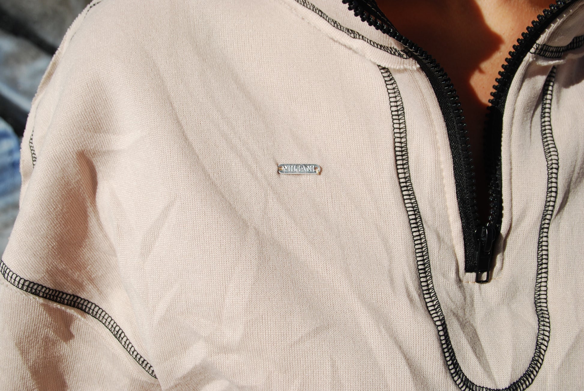 Magtröja med en varm och mjuk insida och dragkedja hals. En silvrig metallplatta med märket MILIANI är dit sydd på höger sida bröst. Resårband nedtill runt magen. Synliga sömmar.