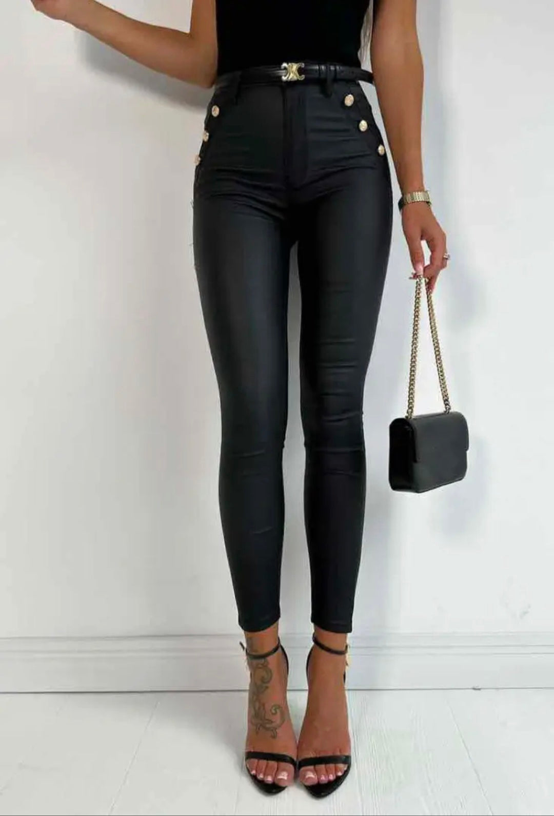 Byxorna är tillverkade i en mjuk mix av bomull och elastan för rörelsefrihet, med ett tunt lager polyuretan som skapar den exklusiva faux läder-looken. Resultatet är ett par byxor som både känns lyxiga och är lätta att bära, oavsett om du stylar dem till vardags med sneakers eller för kvällens fest med klackar.