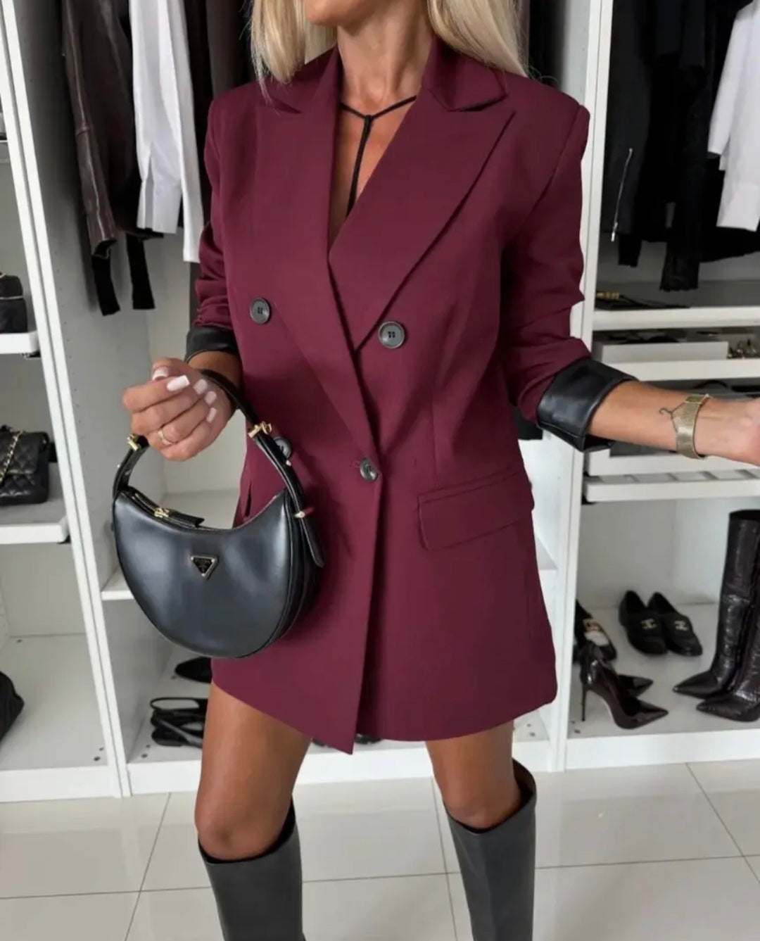 Ge din outfit en sofistikerad touch med denna dubbelt knäppta kavaj i vinrött. Den skräddade passformen och de markerade axlarna skapar en elegant siluett som andas både självsäkerhet och stil.