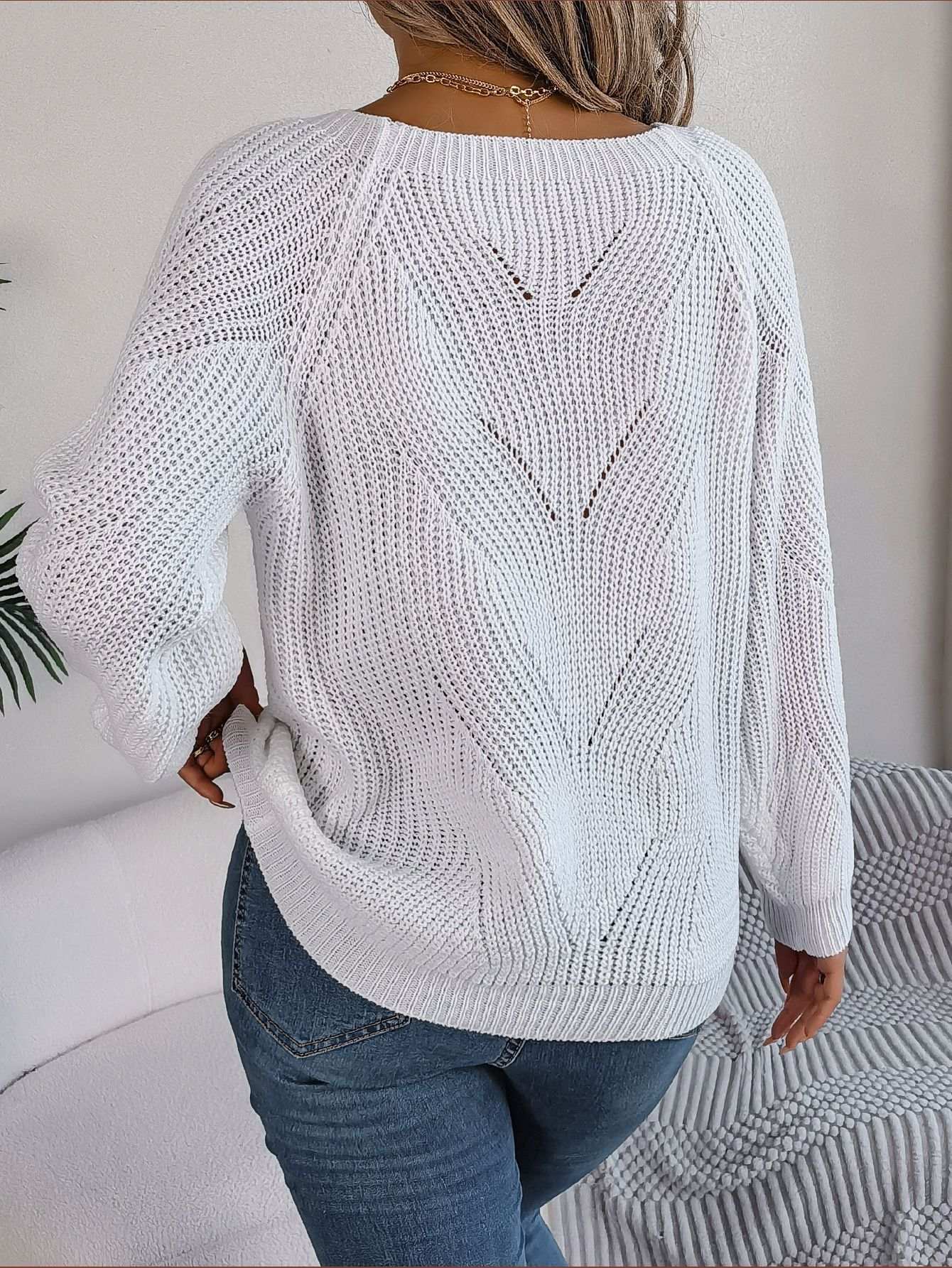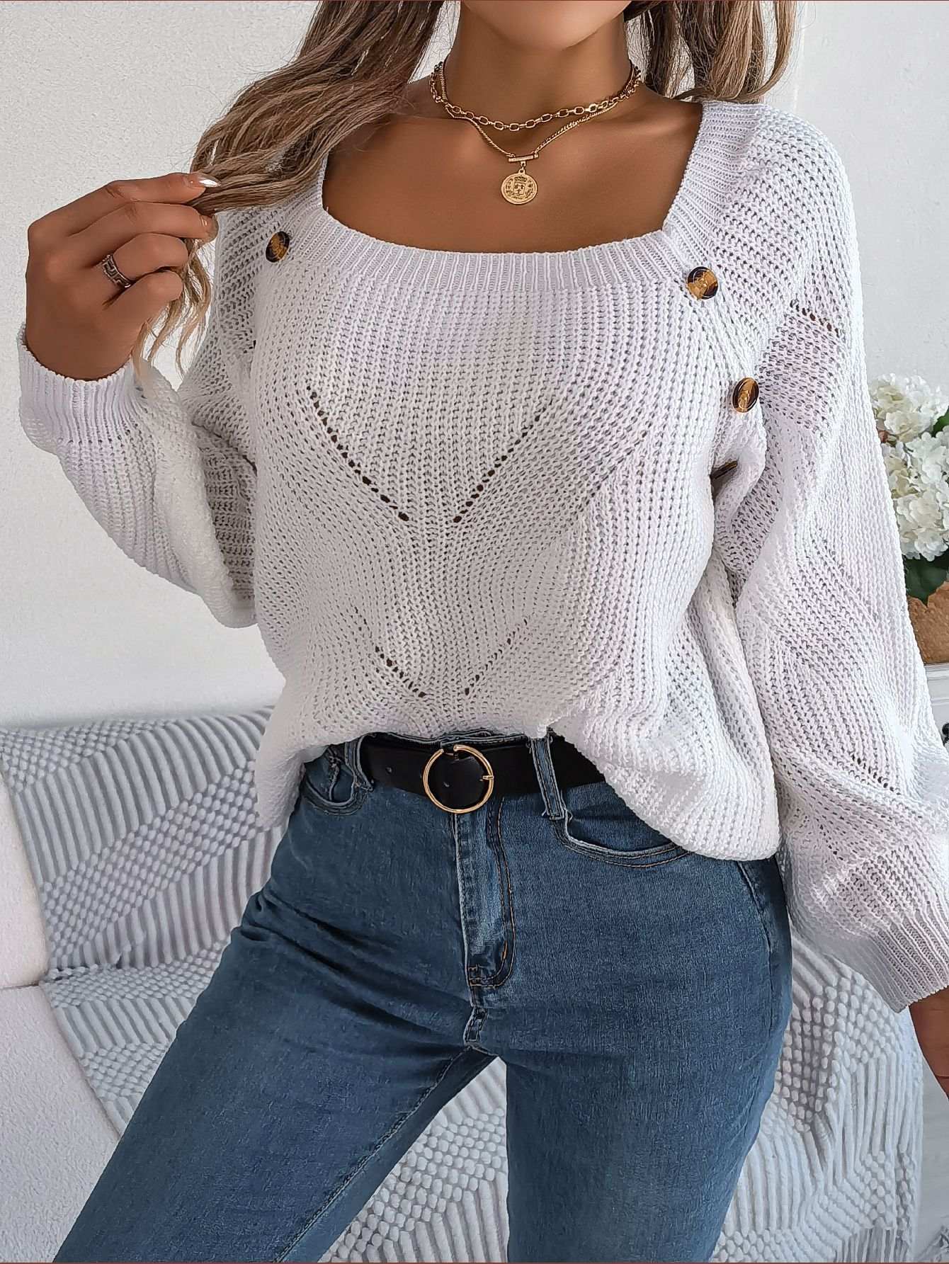 Virkad tröja med knappdetaljer på båda sidor fram.